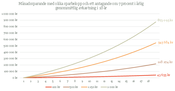 I grafen ovan och i tabellen nedan visas några exempel på vad olika månadssparanden; 100kr, 500kr, 1250kr och 2000kr kan bli efter 18 år om man skulle spara i aktiefonder med en årlig genomsnittlig avkastning på 7 procent efter avgifter, vilket ungefär är börsens historiska avkastning. Och kom ihåg, när man sparar på lång sikt som sparande till barn oftast är så kan även små summor växa sig stora med ränta på ränta effekten.